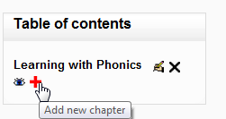 To add another chapter, click on the red cross in the Table of Contents or first chapter. The new chapter will be inserted directly after the chapter whose title is on the same line as the red cross you click.