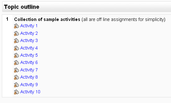 | 22:09, 9 set 2008 | Course view 10 assignments.png (fitxer) | 8 Ko | Initial view of course. 10 off-line assignments prepared for students. No work done on gradebook at this point. | 1 | |