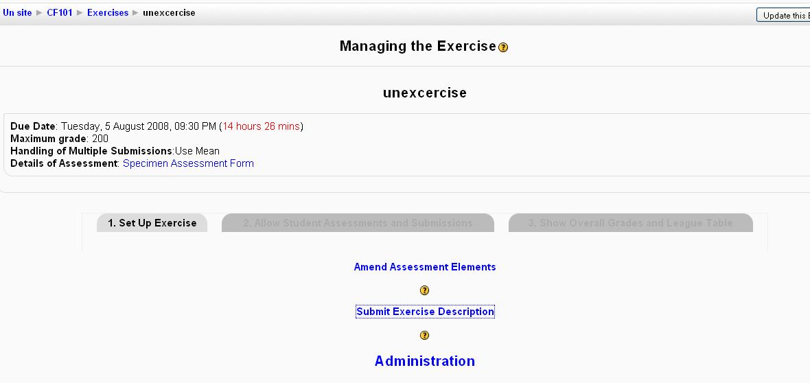 | 13 | Exercise | Info, Setup Exercise (with subtabs Amend Assessment Elements, Submit Exercise Description, Administration), Allow Student Assessments and Submissions (with subtabs Submissions for Assessment, Administration), Show Overall Grades and League Table (with subtabs Display of Final Grades, Administration), Settings, Assign roles, Override permissions | |