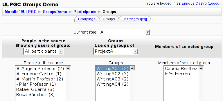 - Display restricted lists of users selected according to membership to specified groupings/groups. In any page presenting lists of users (such as those of Participants list, Assign roles or Group management) there should be possible for the teacher/user to limit the listing to only those users that are members of a given grouping or group, thus allowing the display of only selected users as “potential users” in such lists.
